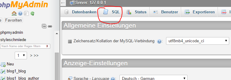 geht bitte in euren Datenbank-Editor (in meinem Fall phpMyAdmin) und führt dort folgenden SQL Code aus: