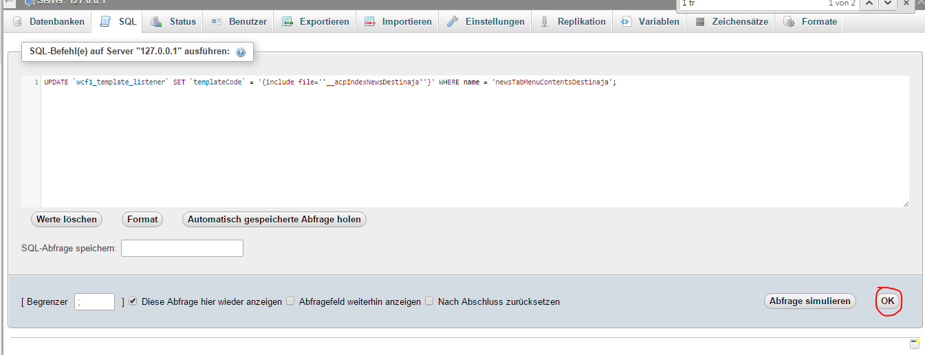 1. go in your database-editor (for me phpMyAdmin) and click on "SQL".