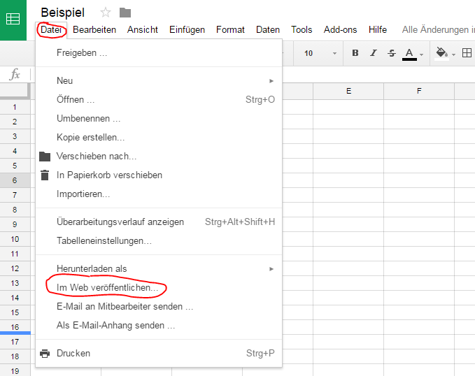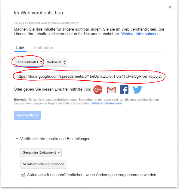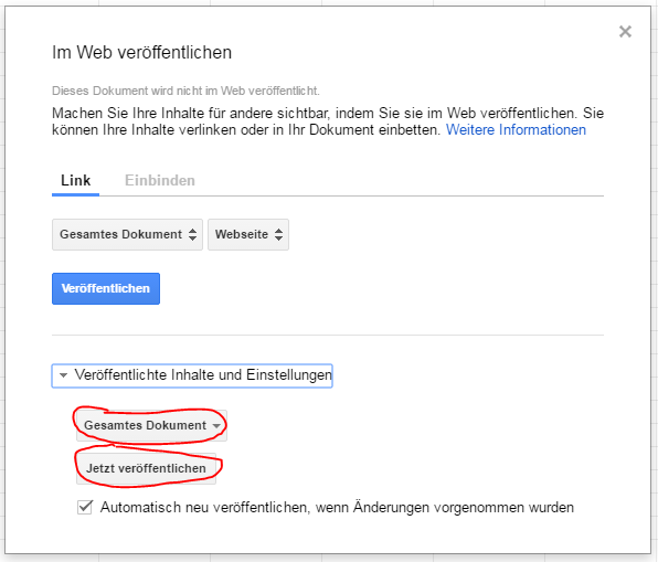 • Dann steht dir aber nur die schreckliche html-Ansicht die wir am Wochenende hatten zur Verfügung. Der einfache Freigabelink ist halt nur für die Verwendung von Google Drive gedacht und nicht für die Einbindung in einer Webseite. Dafür gibt es die Funktion "Im Web Veröffentlichen".